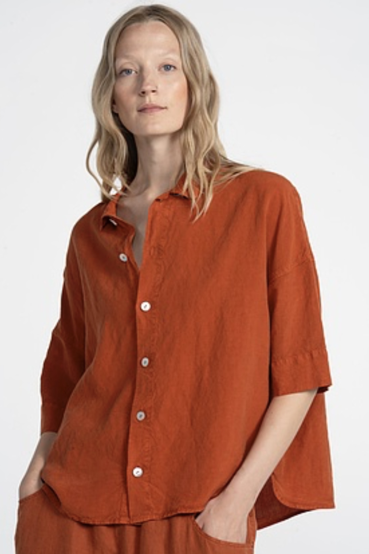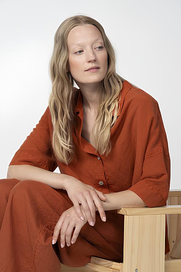 Luftige Leinen-Lyocellmischung, als fertiges Kleidungsstück gefärbt für einen schönen Farbeffekt. Mögliche Unregelmäßigkeiten in der Färbung sind ein gewünschter Effekt und keine Mängel. Gewebt in Deutschland und exklusiv bei ISCHIKO. 68% des Stoffes sind aus Tencel™ Lyocell, eine biologisch abbaubare Faser, die aus Zellstoff schnell wachsender Holzarten hergestellt wird. Die Faserherstellung selbst ist aufgrund eines geschlossenen Kreislaufes besonders umweltfreundlich. Der Stoff ist biologisch abbaubar.