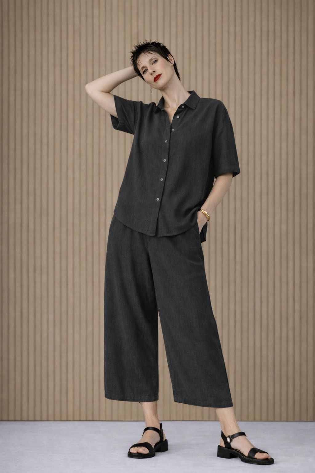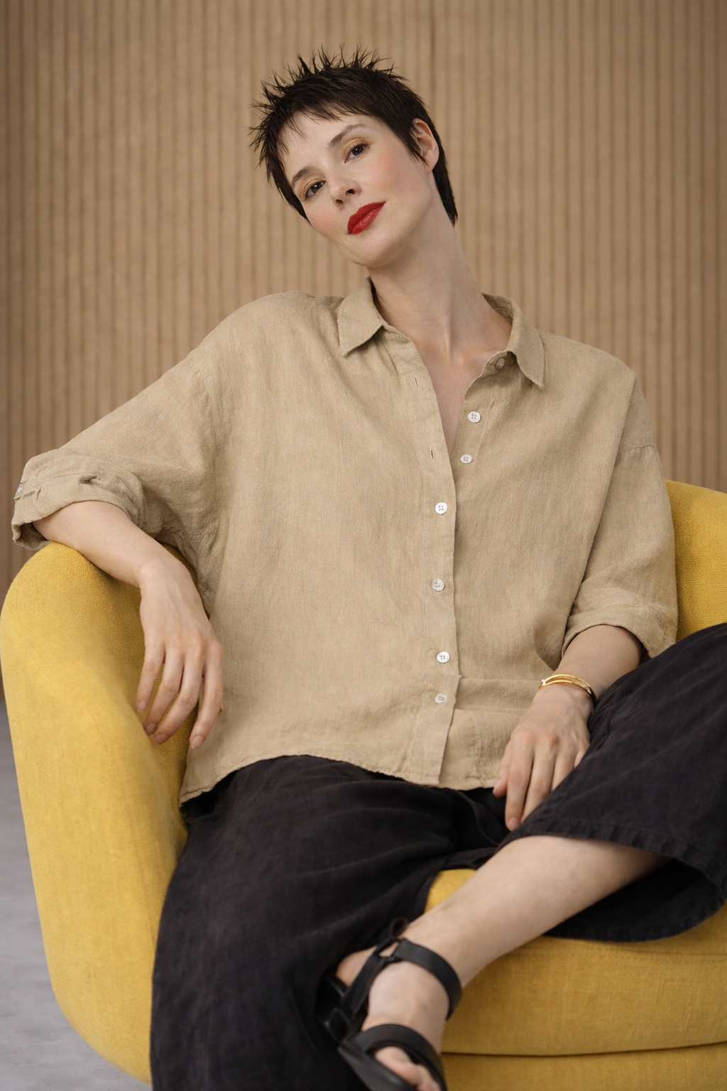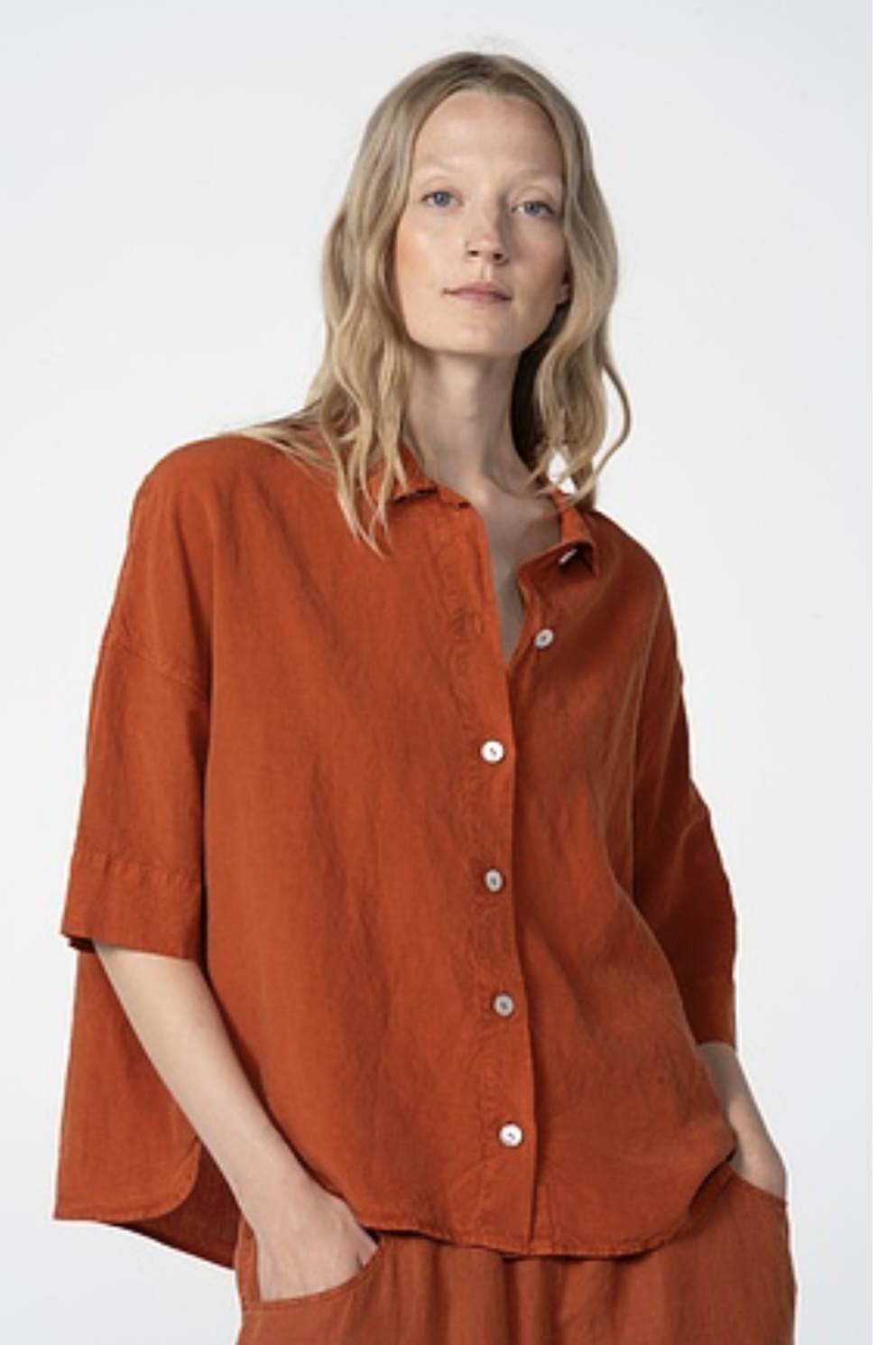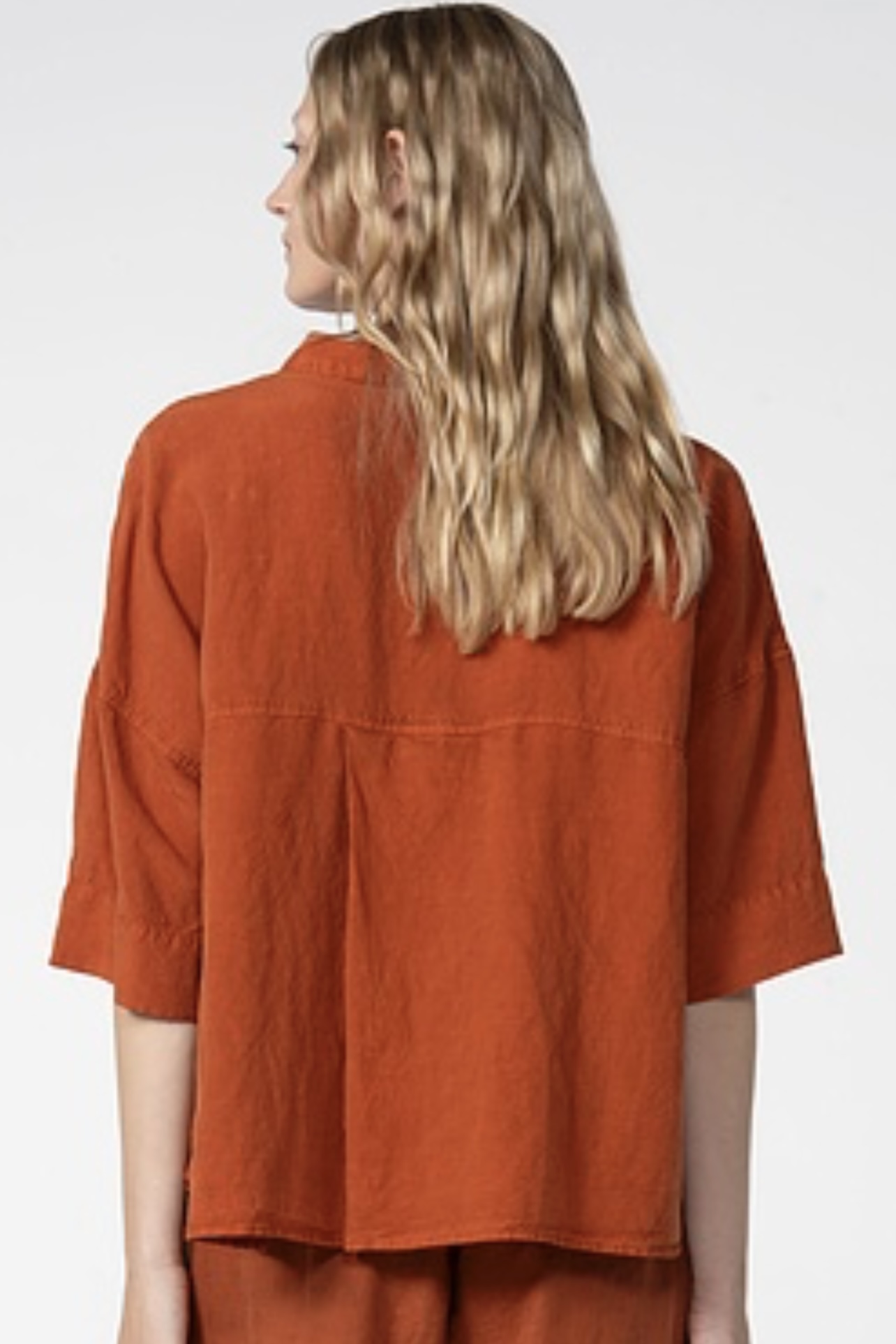 Diese ISCHIKO Bluse 611 hat eine verkürzte, kastenförmige Silhouette mit überschnittenen Schultern und tief angesetzten kurzen Ärmeln. Das Modell verfügt über einen klassischen Hemdkragen, eine durchgehende Knopfleiste und einen abgerundeten Saum. Eine tiefe Falte am Rücken sorgt für zusätzlichen Tragekomfort. Kombinieren Sie die Bluse mit der passenden Hose 607 für einen schönen, sommerlichen Hosenanzug.