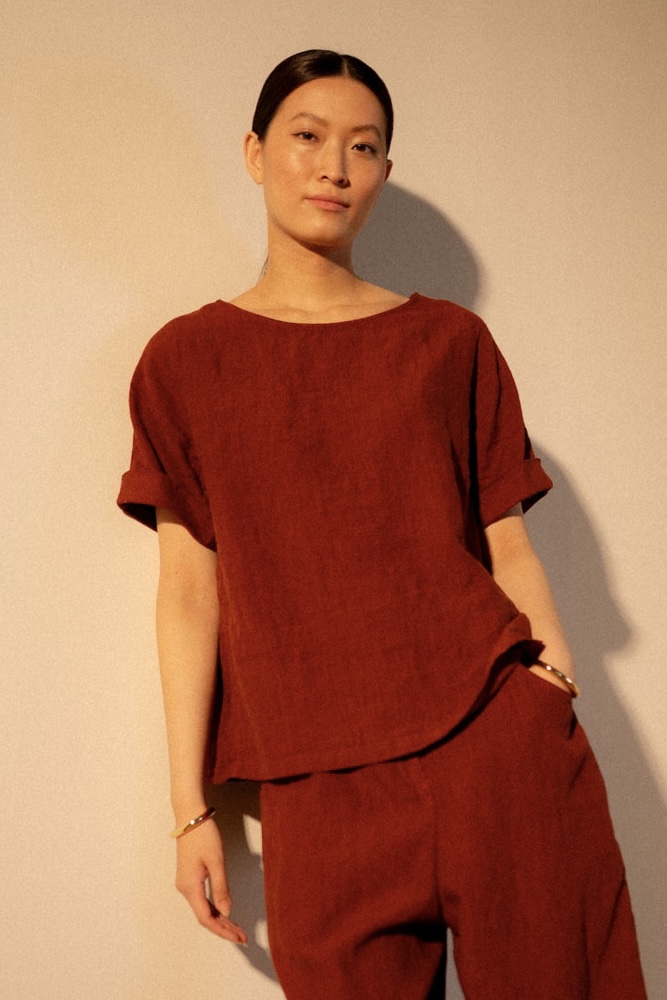 Wir lieben sie einfach: Die OSKA Bluse 629 – ehemals Vicaare – ist eine schlichte, schöne Sommerbluse. Gefertigt aus edlem Leinen-Baumwoll Fil-à-Fil hat sie eine feminine A-Linie, die durch Teilungsnähte betont wird. Das Modell hat einen runden Ausschnitt, kurze Ärmel im Kimono-Stil, die man umschlagen kann, und eine Falte im Rückteil, die für mehr Bewegungsfreiheit sorgt und optisch ein „Hinschauer“ ist. Die Bluse ist in vielen Saisonfarben erhältlich.