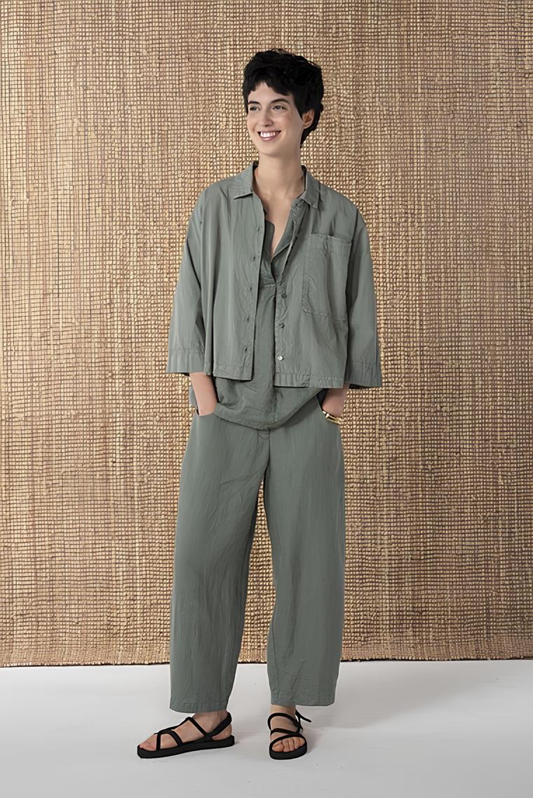 Dichtgewebte, leichte Baumwolle mit sanft knittriger Oberfläche, gefärbt als fertiges Kleidungsstück für einen schönen Farbeffekt. Mögliche Unregelmäßigkeiten in der Färbung sind ein gewünschter Effekt und keine Mängel. Der Stoff wurde in Italien gewebt.