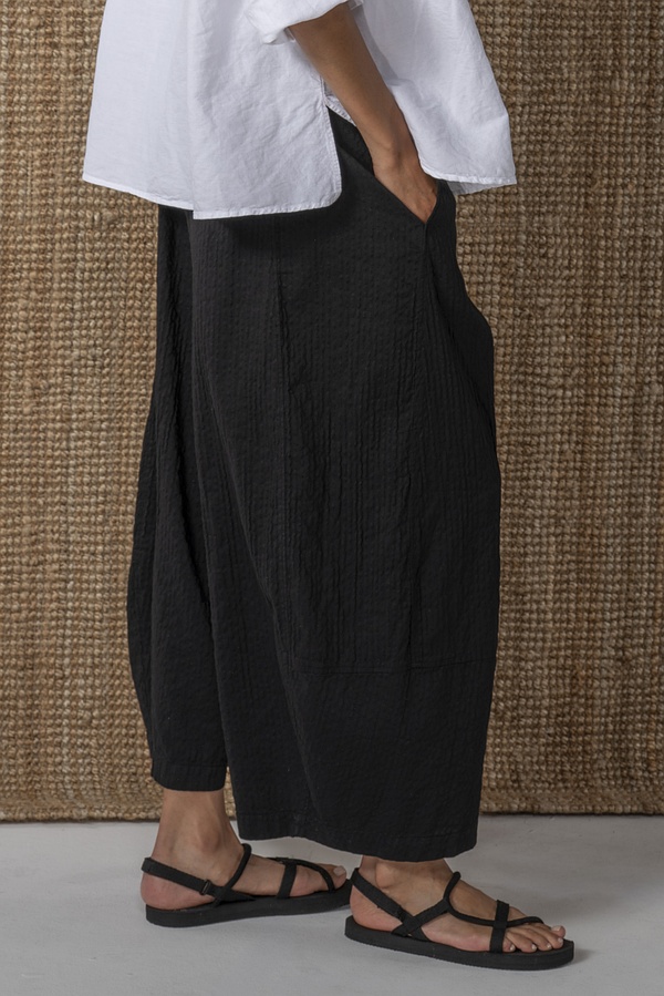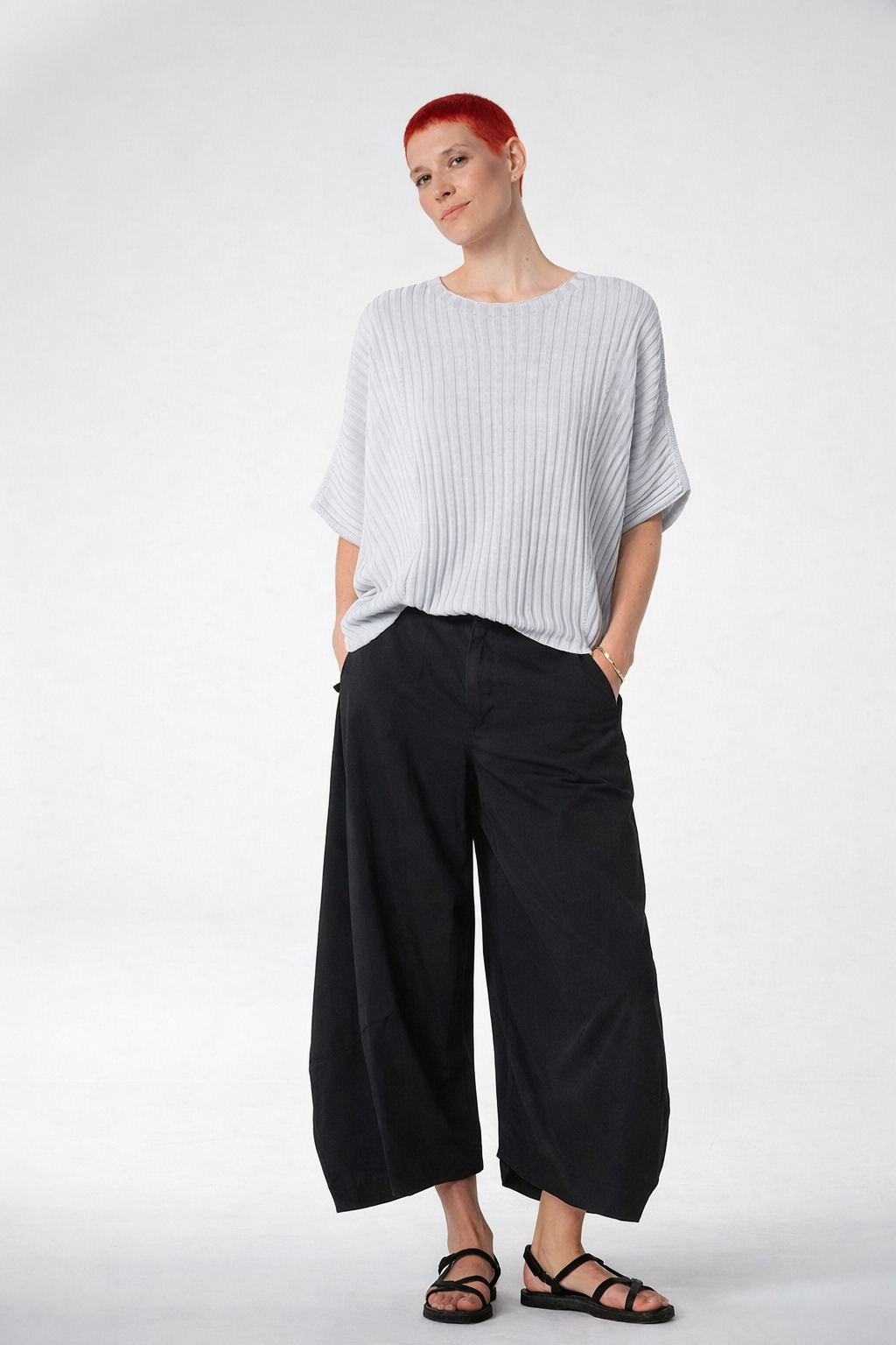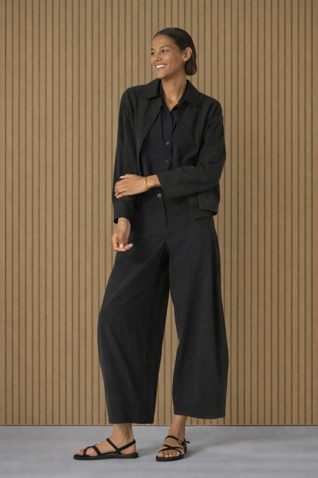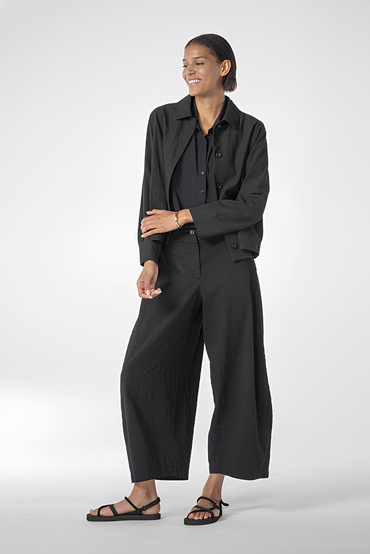 Unsere Lieblingshose: Die OSKA 642 ist eine typische OSKA-Hose in ausdrucksstarker O-Silhouette, die aus einem festen Baumwoll-Leinen-Stoff mit Melange-Streifen gefertigt wurde. Die Hose wurde stückgefärbt für einen schönen Farbeffekt. Die Hose sitzt an der Hüfte schmal und hat zum Saum hin eine weite Barrel-Form. Hosen zeigen wieder Volumen! Apart und lässig sind die Eingriffstaschen im Vorderteil. Die Hose hat einen festen Bund im Vorderteil und hinten einen Gummibund, der für Bequemlichkeit sorgt. Die Hose ist mit Zipper und Knopf ausgestattet. Für einen kompletten Hosenanzug kombinieren Sie zur Hose die Jacke 611 aus dem gleichen Material – ein toller Hosenanzug.