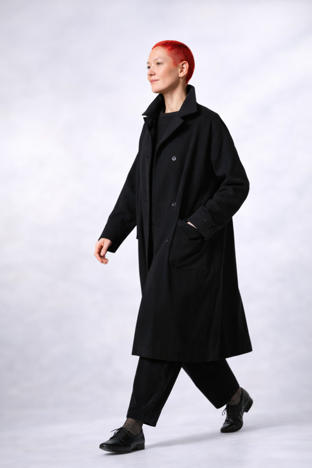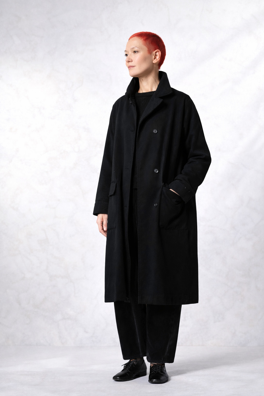 Der etwa knielange OSKA Mantel 504 wurde aus einem kompaktem, weichen Baumwolltwill gefertigt und hat eine lockere Passform. Er hat einen Umlegekragen, eine durchgehende Knopfleiste und aufgesetzte Statement-Taschen. Seine Aussenseite ist wasserabweisend ausgerüstet. Ein besonderer „Blickfang“ ist die schräg aufgesetzte Brusttasche. Dieser Mantel ist ein Klassiker für kühle Herbsttage! Für ein komplettes Outfit kombinieren Sie die Hose 534 wash dazu, die aus dem gleichen Material gefertigt wurde.