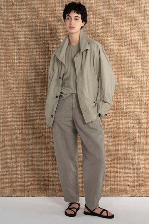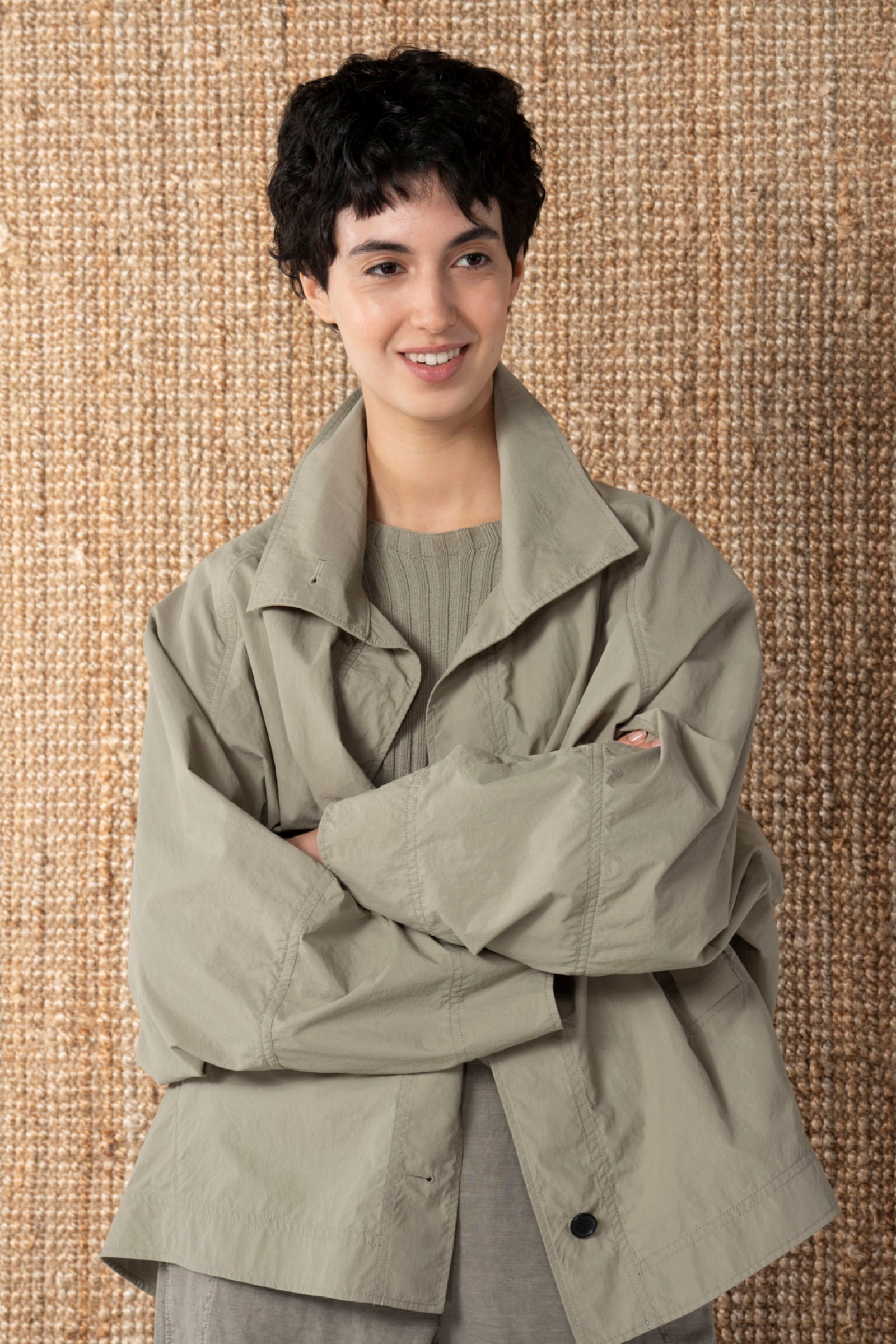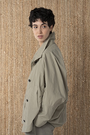 Diese Outdoorjacke 603 von OSKA ist ein echter Blickfang. Sie besticht durch ihre lässige Silhouette und ausgefallene Schnittführung. Das Modell ist großzügig weit geschnitten, etwa hüftlang und hat voluminöse Raglanärmel. Ein hoher Stehkragen, eine Knopfleiste vorne und sportliche Leistentaschen komplettieren den minimalistisch-modernen Stil. Die Jacke, die aus einer Baumwollmischung mit technischer Oberfläche gefertigt wurde, ist wasserabweisend ausgerüstet.