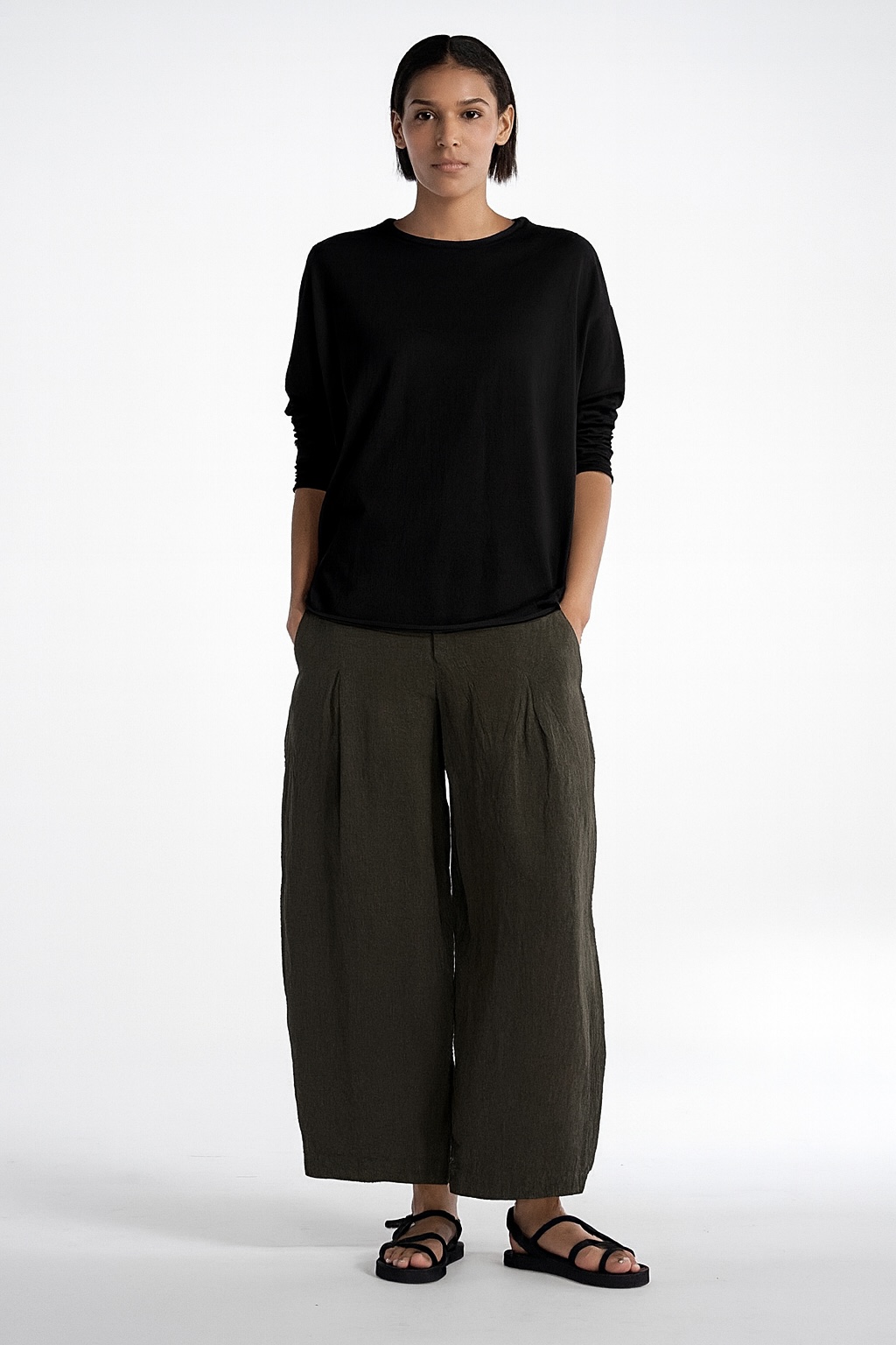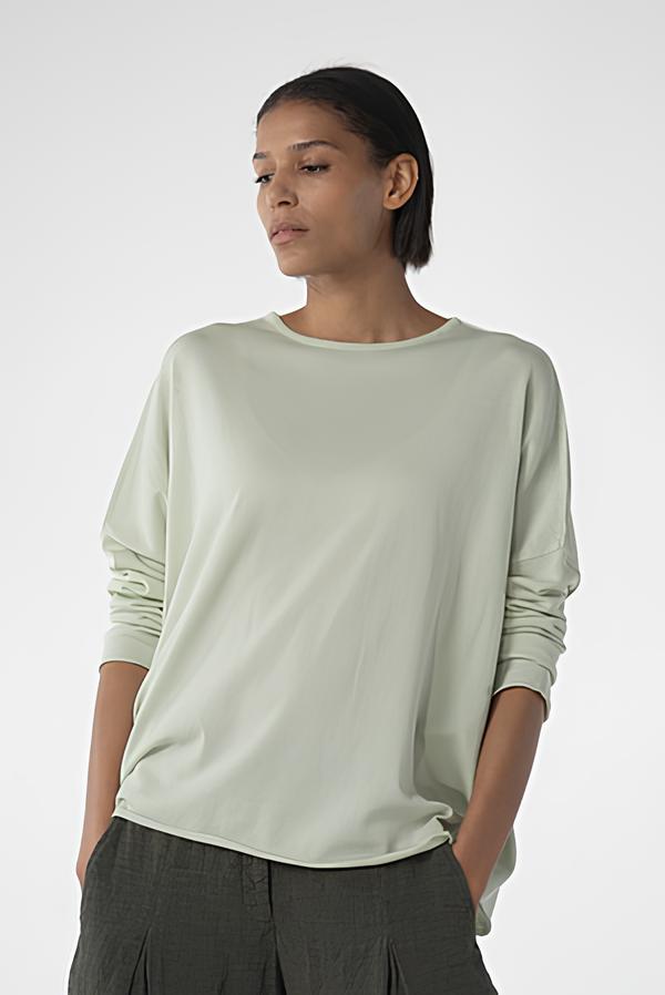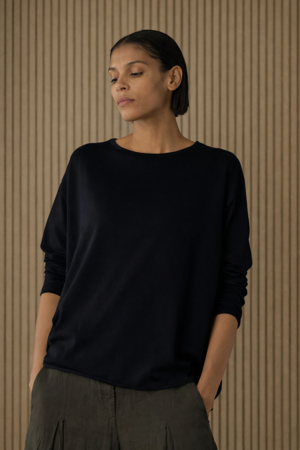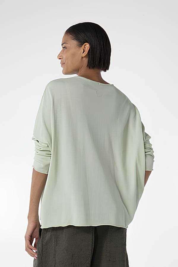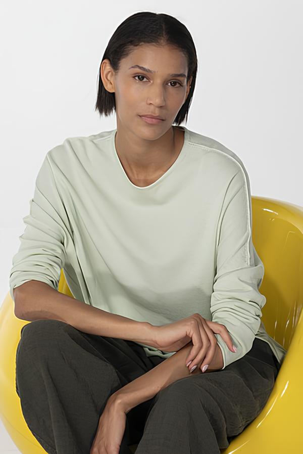 Der aus superfeinem Baumwollkrepp gestrickte, hüftlange OSKA Pullover 612 hat nach außen gelegte Nahtzugaben. Der weite Schnitt mit tief angesetzten, schmalen Ärmeln sorgt für eine entspannte Passform. Er hat einen runden, gerippten Ausschnitt und Saumkanten, die sich minimal aufrollen. Dank seines minimalistischen Designs lässt er sich in jedes Outfit integrieren.