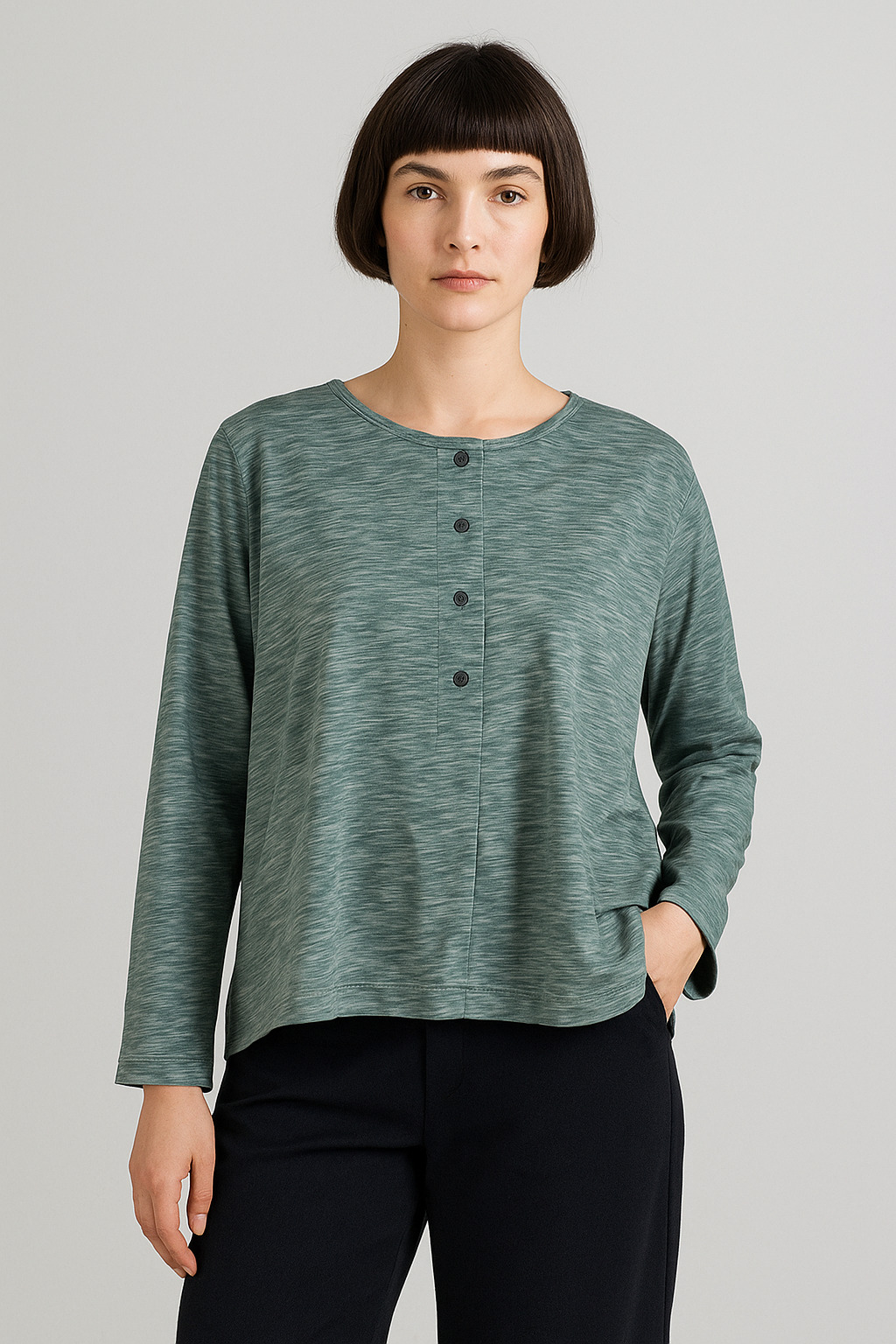 Es ist langärmelig und lässig geschnitten und fällt in lockerer Passform bis zur Hüfte. Das Shirt hat überschnittene Schultern, einen geknöpften Ausschnitt, der in eine Mittelnaht übergeht. Dieses Basic-Shirt ist ein toller Begleiter für solitär oder unter einer Jacke zu tragen.